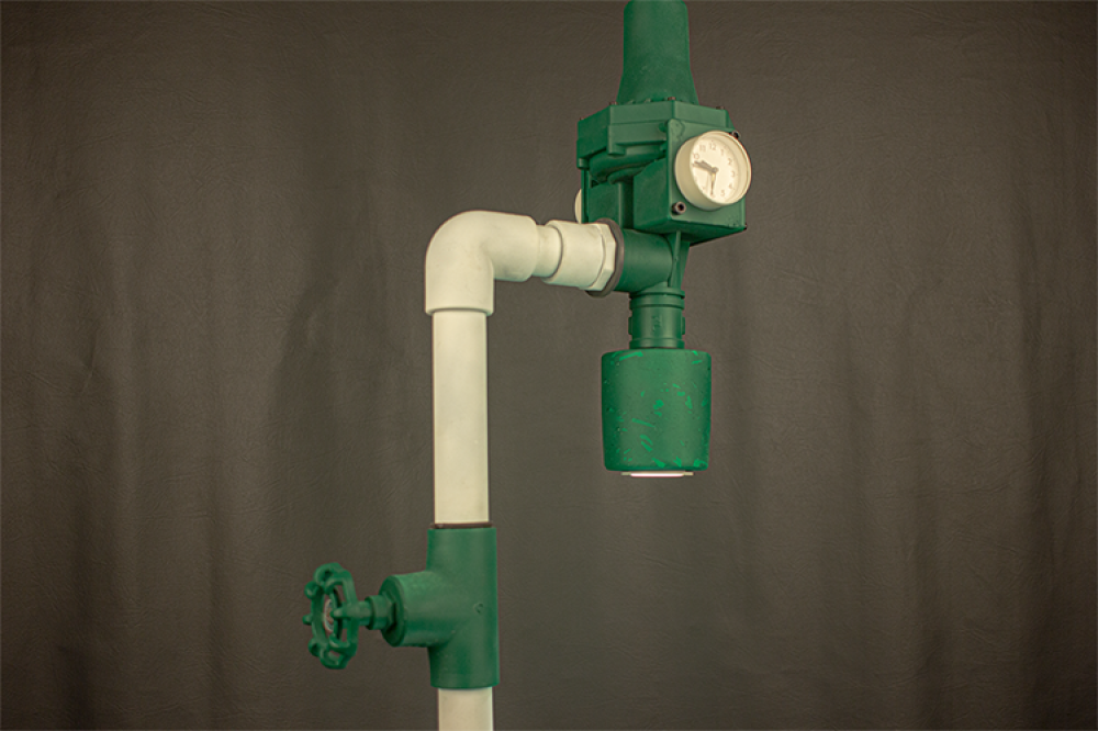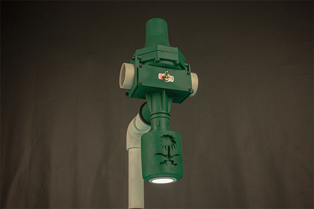 " تم تصنيع مجسم الاضاءة والقاعدة الارضية للأبجورة من حجر التيرازو ، وتم حفر عليهم رمز المملكة ٫ لتكون الابجورة اكثر فخامة وجمالية وتميز "